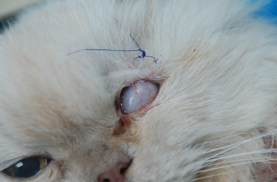 Protrusão da membrana nictitante (vemos uma membrana branca no olho)