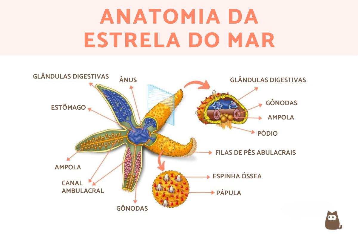 A anatomia da estrela-do-mar é caracterizada por sua simetria radial (geralmente pentarradial, ou seja, com 5 braços, embora algumas espécies possam ter até 20 braços), com vários braços que se estendem a partir de um ponto central. Esses braços contêm uma complexa rede de canais do sistema hidrovascular, permitindo movimentos coordenados e a capacidade de sugar e expelir água. Embora seu sistema nervoso seja rudimentar em comparação com os vertebrados, as estrelas-do-mar exibem comportamentos surpreendentes, como a capacidade de regenerar braços perdidos. Confira neste outro artigo alguns exemplos de animais que se regeneram.