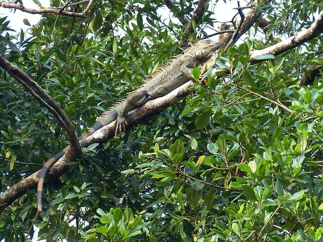 A iguana é um réptil aborícola. Quando é jovem tem uma cor verde brilhante muito atrativa, que se torna em um tom cinza apagado à medida que se torna adulta. Vive sempre perto da água e quando se sente em perigo não hesite em se lançar a ela, pois nada muito bem.