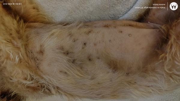 Minha pet está aproximadamente com essas manchas na pele e pelo oleoso, tem aumentado nesse período. O q poderia ser? Seborreia?