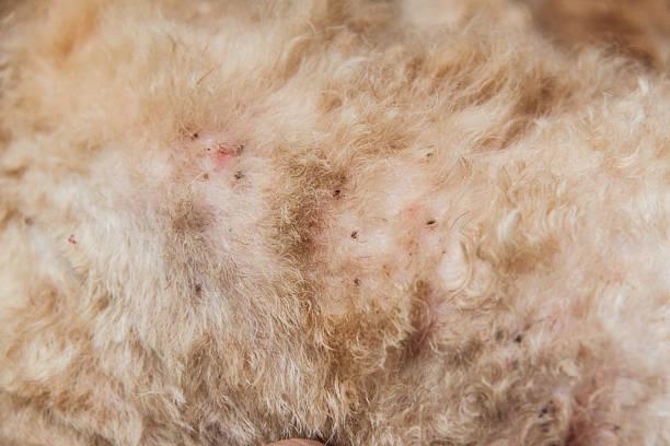As pulgas, por sua vez, também se alimentam do sangue dos cachorros, podendo causar espinhas, especialmente em cachorros com alergia à picada. Nesses casos, elas vão aparecer na região lombossacral, perineal, abdominal, posterior das patas traseiras ou músculos. O cachorro terá espinhas e o pelo cairá devido ao intenso arranhar causado pela coceira. Se não for tratado, a pele vai engrossar e escurecer, pode ser necessário tratamento para esses sintomas e você deve sempre desparasitar o animal.