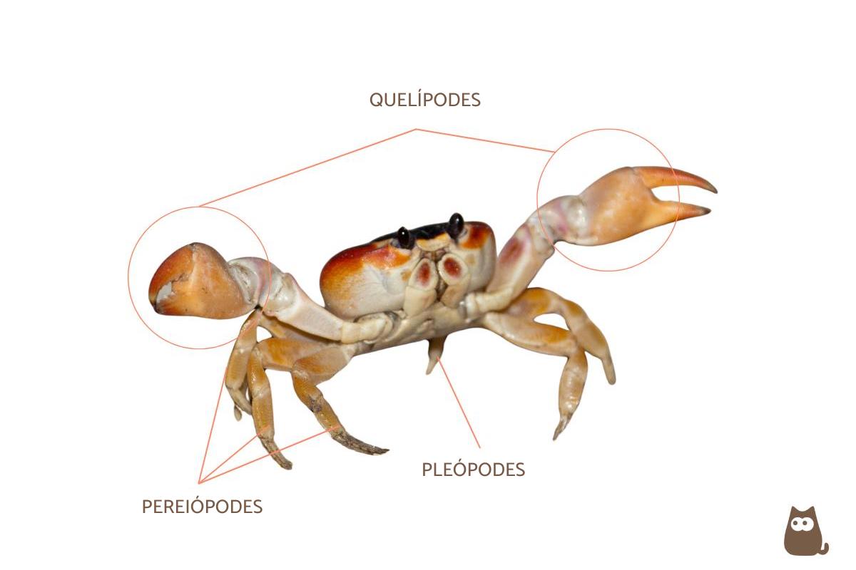 - Quelípedos: Ou pinças, são apêndices proeminentes que se estendem do cefalotórax e são usados para a defesa, manipulação de alimentos e, em algumas espécies como os caranguejos violinistas, em comportamentos de cortejo. Em espécies como o caranguejo azul, uma pinça costuma ser maior e especializada para cortar ou triturar.