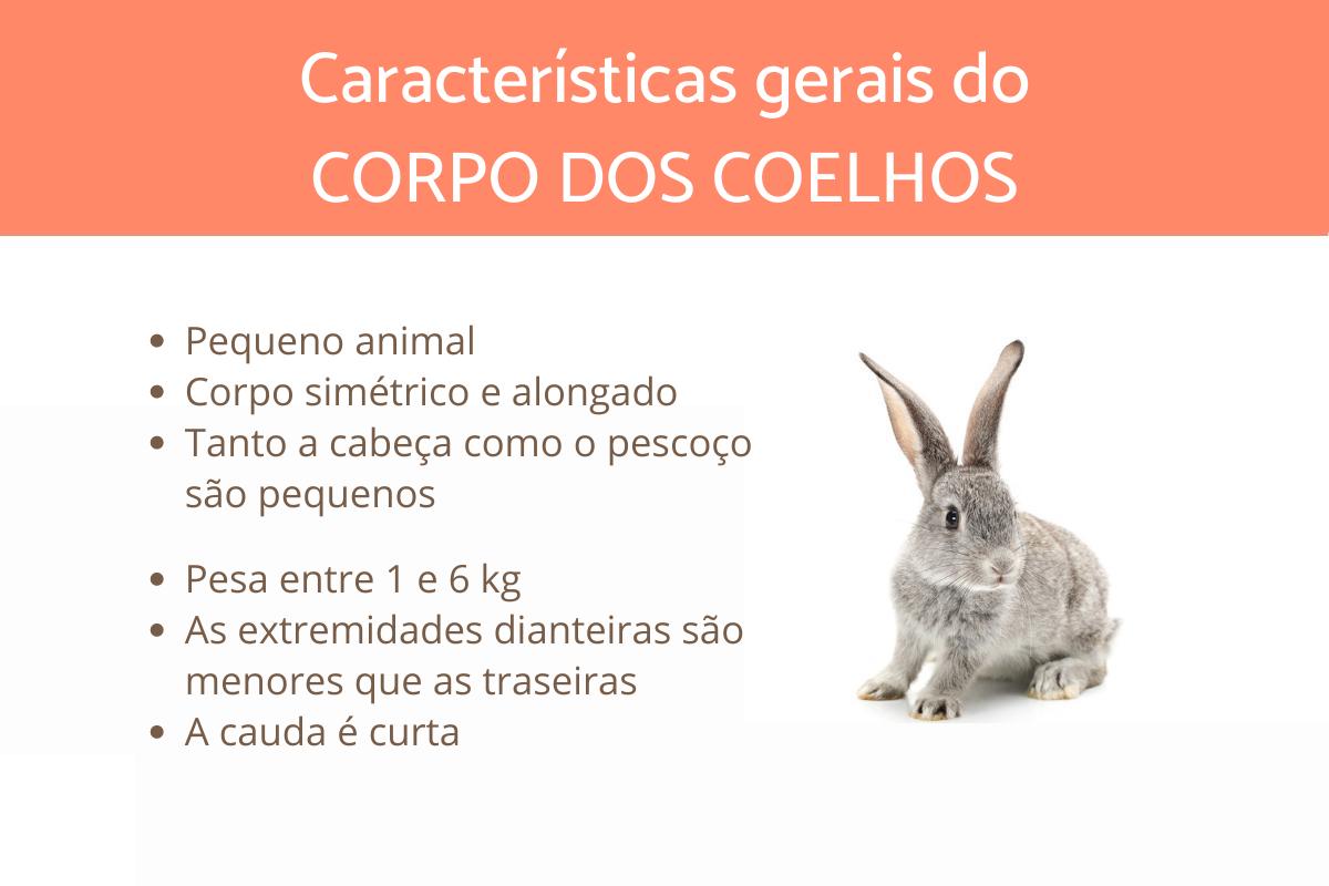 O coelho é um animal pequeno, de corpo simétrico e alongado. O peso muda de acordo com a variedade ou raça, podendo variar de 1 kg até os 6 kg. Tanto a cabeça como o corpo são pequenos, em alguns coelhos a pele forma dobras nessa última estrutura como se fosse uma papada. Possui glândulas para a produção de feromônios no queixo e na área perianal, que utiliza para se comunicar e marcar o território.