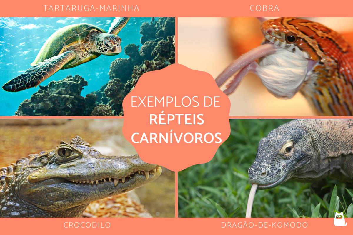 Quanto aos répteis, são aqueles animais vertebrados com escamas epidérmicas de queratina. Os que são carnívoros são todos os da família Crocodylidae, na qual se encontram os jacarés e crocodilos, todas as cobras e algumas tartarugas, como as tartarugas-marinhas. A título de exemplo de animais carnívoros do grupo dos répteis, listamos aqui alguns dos mais representativos.