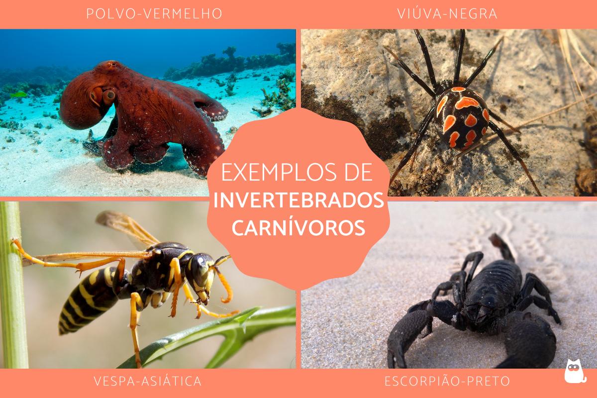 E por último, mas não menos importante, alguns exemplos de animais invertebrados carnívoros, ou seja, que não possuem um esqueleto ósseo, são alguns crustáceos, todos os moluscos, como os polvos, alguns gastrópodes e também as aranhas, os escorpiões e alguns insetos como as vespas ou o louva-deus.