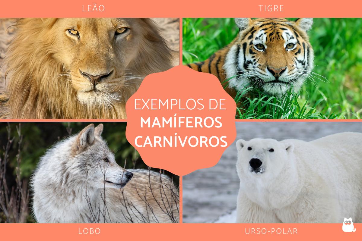 Dentro dos mamíferos, que são aqueles animais de sangue quente que alimentam as suas crias através da produção de leite segregado por glândulas mamárias, os principais carnívoros são todos os felinos, como o tigre, o leão, o puma ou o gato doméstico.