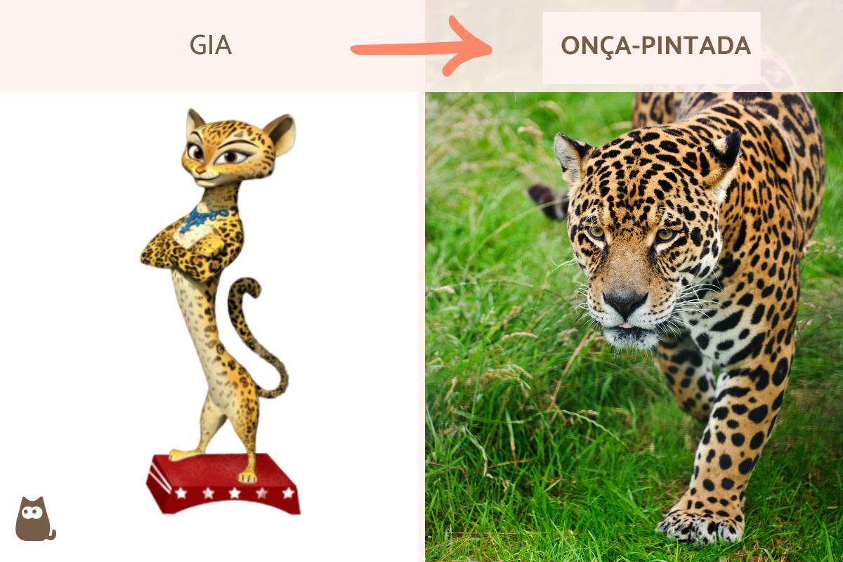 Gia também faz parte do terceiro filme de Madagascar e é o primeiro amor de Alex. Gia é uma onça-pintada (Panthera onca), o terceiro maior felino do mundo e o maior das Américas, onde é nativo. Vive em diversos ecossistemas com cobertura vegetal densa e presença de água, onde pode encontrar presas suficientes. Um adulto pode pesar cerca de 140 kg e medir cerca de 1,5 m. É classificada como "quase ameaçada" devido à perda de habitat e à matança em massa.