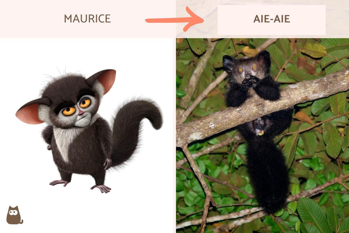 Na vida real, Maurice seria um aie-aie (Daubentonia madagascariensis), um tipo de primata também endêmico de Madagascar e relacionado aos lêmures. Este animal é raro de se ver e habita diversos tipos de florestas e espaços cultivados. Tem um comprimento médio de 40 cm, uma cauda longa e uma massa corporal em torno de 25 gramas. Sua pelagem é densa e de cor marrom escuro a preto, com pelos brancos dispersos. O rosto e a garganta podem ter tons de cinza mais claros.