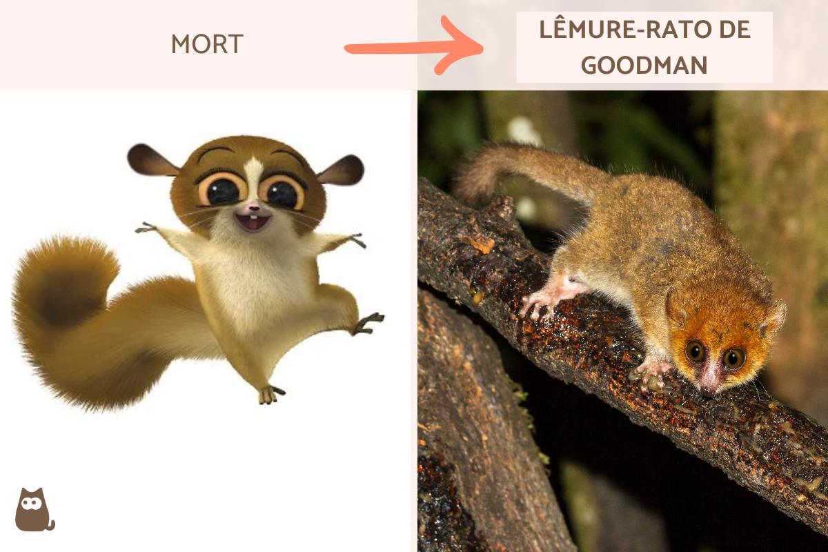 Mort é um personagem simpático próximo ao Rei Julien, embora para este seja irritante tê-lo por perto. Este pequeno animal do filme Madagascar é um lêmure-rato de Goodman (Microcebus lehilahytsara), outro primata endêmico da ilha. Ele é um pouco maior que um rato, com uma pelagem marrom em toda a parte superior do corpo, enquanto a parte ventral é clara. Apresenta uma faixa clara entre os olhos, que são grandes, e tem uma longa cauda. Tem hábitos arborícolas, vivendo em florestas tropicais e em algumas plantações de eucalipto. É classificado como "quase ameaçado" devido à perda de habitat causada pela mineração e práticas agrícolas muito intensas.