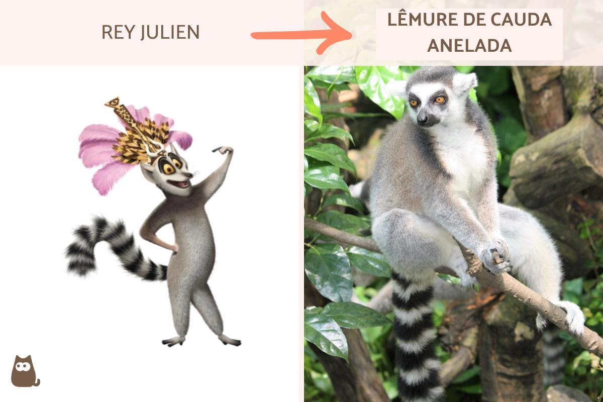 Uma das perguntas mais frequentes é quais animais são o Rei Julien de Madagascar. Na vida real, esse personagem do filme corresponde a um lêmure de cauda anelada (Lemur catta), que, como todos os lêmures, é endêmico de Madagascar. Apresenta uma pelagem de cor cinza a marrom, com anéis definidos em branco e preto na cauda. Seu tamanho médio é de 42 cm, com uma cauda de 60 cm, e uma massa média de 2,2 kg. Está classificado como "em perigo de extinção" devido à alteração do habitat, à caça e à comercialização ilegal como animal de estimação.