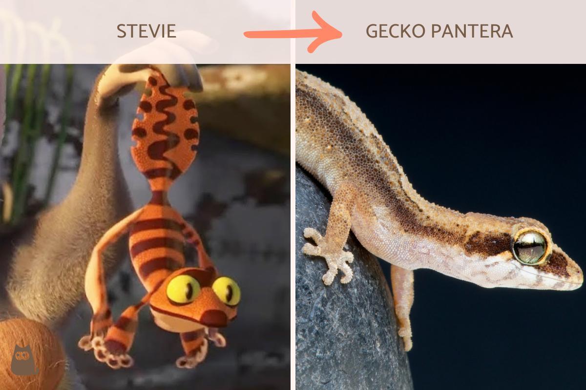 Outro animal do filme Madagascar é Stevie, um gecko que está presente em uma segunda coroa que o Rei Julien possui. Não se precisa a espécie à qual pertence este pequeno réptil. Devido às suas características, poderia ser um gecko pantera ou ocelote (Paroedura picta), endêmico de Madagascar e de hábitos terrestres. Este gecko vive na folhagem ou na areia de arbustos espinhosos. É marrom, com manchas, e mede de 10 a 15 cm; é classificado como de Menor Preocupação.