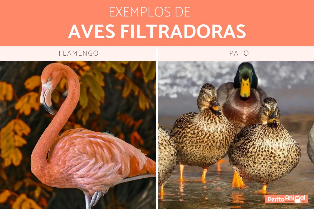 Entre as aves, também encontramos algumas que se alimentam por filtração. Especificamente, são indivíduos que vivem a maior parte do tempo em corpos d'água, e algumas delas podem inclusive ser excelentes nadadoras. Elas podem ser: