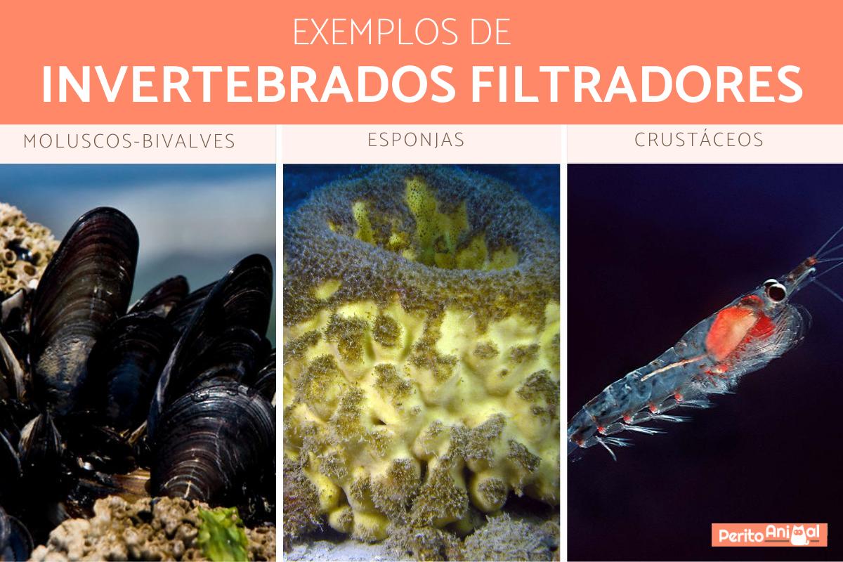 - Esponjas: os poríferos também são invertebrados filtradores que possuem um sistema corporal muito bem adaptado para esse processo, com múltiplas câmaras com flagelos que retêm partículas orgânicas, bactérias, protozoários e plâncton em geral, para se alimentar. Este grupo também é capaz de armazenar substâncias contaminantes presentes na água.