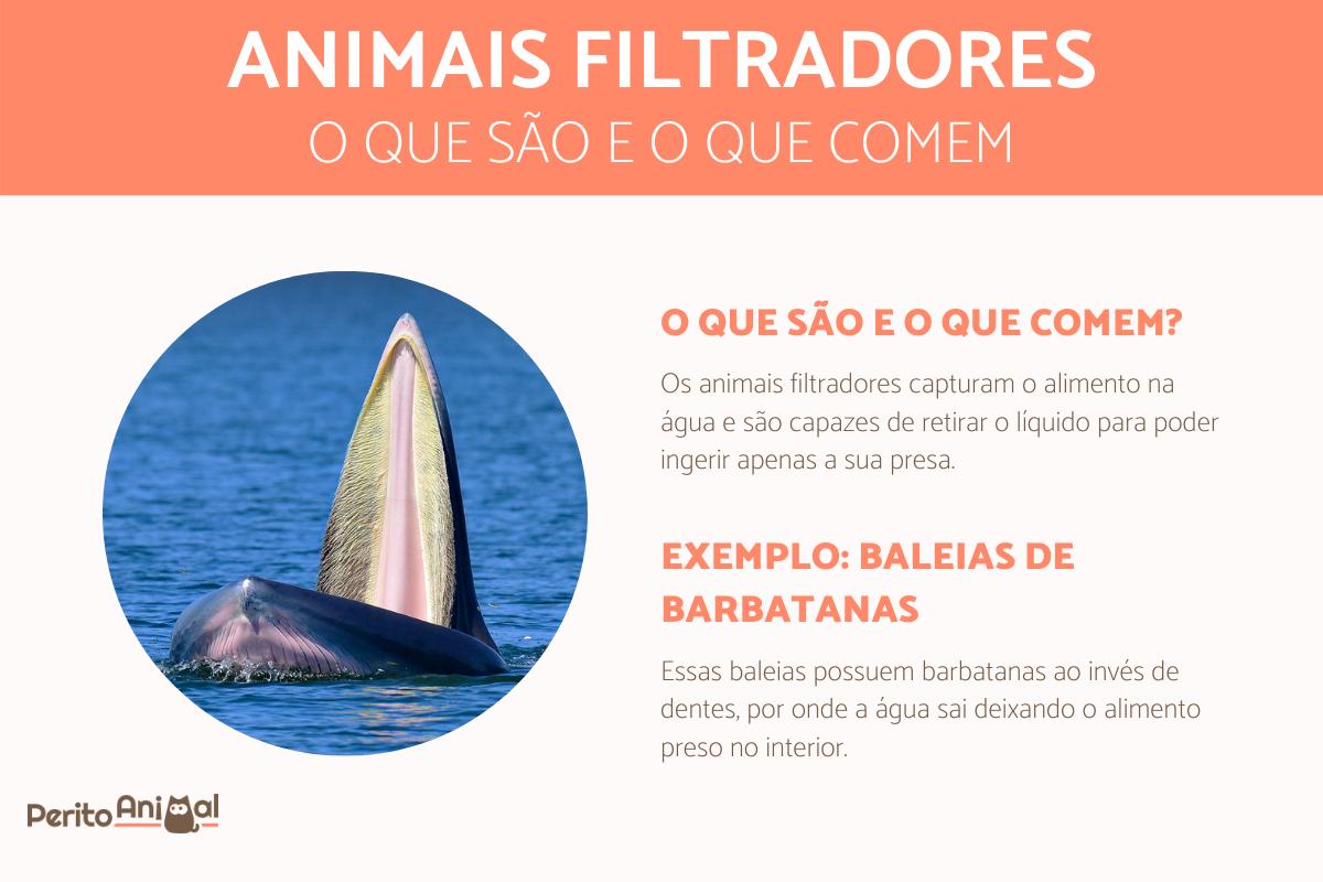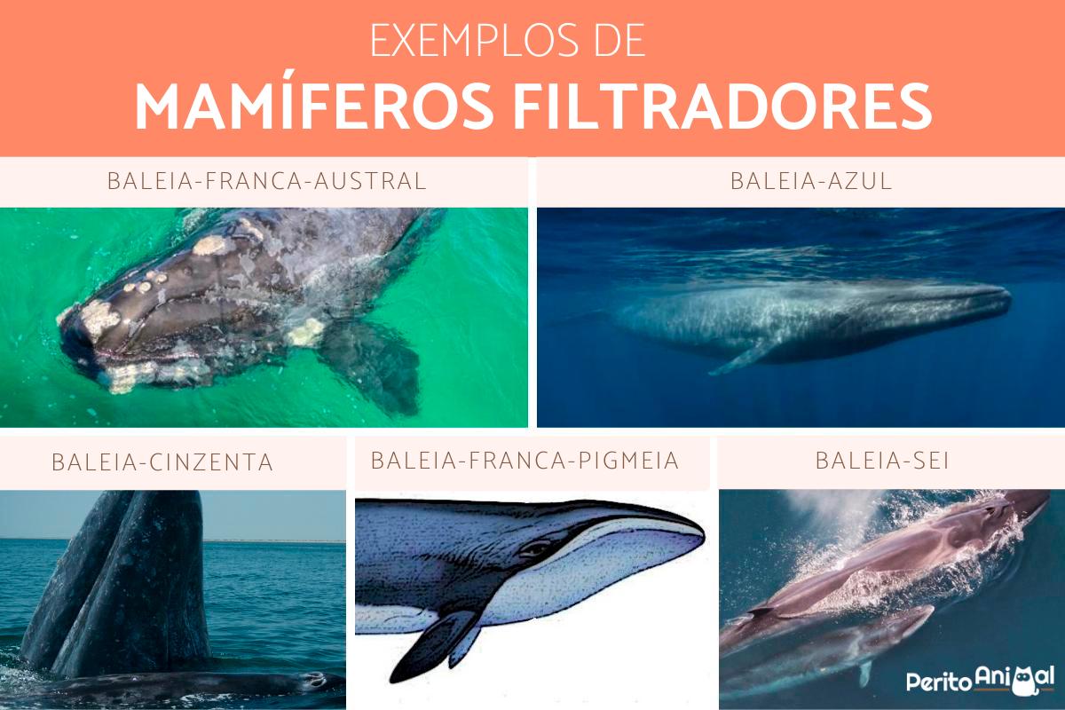 Dentro dos mamíferos filtradores, encontramos os misticetos, que são as baleias de barbatanas, grupo onde encontramos o maior mamífero da Terra. Esses animais não têm dentes e, em vez disso, têm lâminas flexíveis feitas de queratina, que são chamadas também de barbatanas e estão localizadas na mandíbula superior. Assim, ao nadar, a baleia mantém a boca aberta para que a água entre. Então, com o auxílio da língua, expulsa a água, e as presas de tamanho adequado ficam retidas nas farpas e são ingeridas.