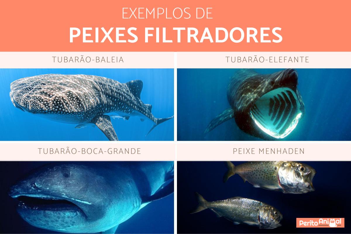 No grupo dos peixes também existem várias espécies que são filtradoras, e sua alimentação pode consistir em plâncton, pequenos crustáceos, outros peixes menores e, em alguns casos, algas. Entre os peixes filtradores, encontramos por exemplo: