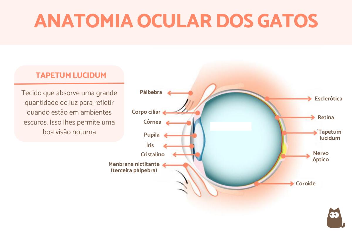 Outra estrutura que auxilia muitos animais a terem uma boa visão noturna é conhecida como "tapetum lucidum", um tecido localizado atrás da retina que funciona como um espelho, ajudando a aproveitar melhor a escassa luz que entra no olho. Isso aumenta a disponibilidade de fotorreceptores. O funcionamento é simples: ele absorve uma grande quantidade de luz para refleti-la quando há escuridão. Este é o caso dos felinos, como os gatos domésticos, razão pela qual têm boa visão noturna, como explicado neste post: "Como os gatos enxergam?". Como exemplo, mostramos uma imagem da anatomia do olho do gato para visualizar com maior clareza a localização desse tecido.