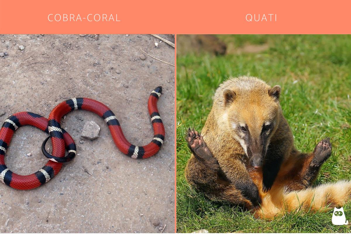 - Quati (Nasua): se for criado em casa, jamais pode ser solto, devido à sua personalidade bastante destrutiva e agressiva, visto que se trata de uma espécie silvestre e não doméstica.