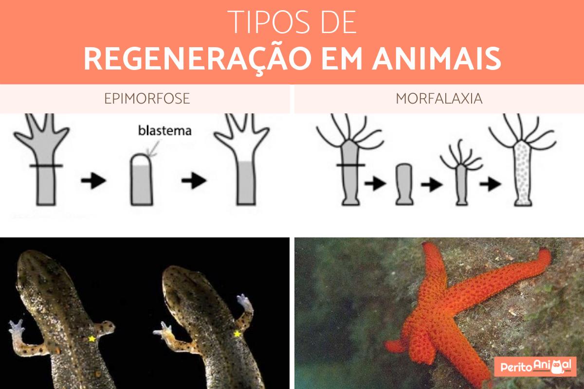 - Epimorfose: consiste na formação de um tecido indefinido conhecido como blastema, onde a proliferação celular ocorre e dará origem à estrutura danificada ou perdida. Exemplos de animais com esse tipo de regeneração: platelmintos, anfíbios e ofiuroides.