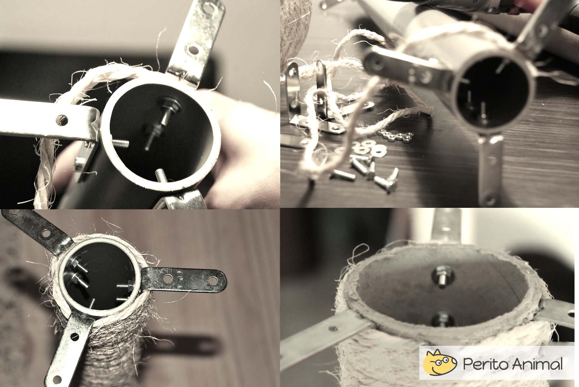 - O próximo passo é montar a estrutura. Para isso, fixe muito bem os tubos aos pedaços de madeira. Lembre-se que pode fazer um arranhador simples com uma base e um tubo ou uma estrutura muito mais complexa com andares e caixas.