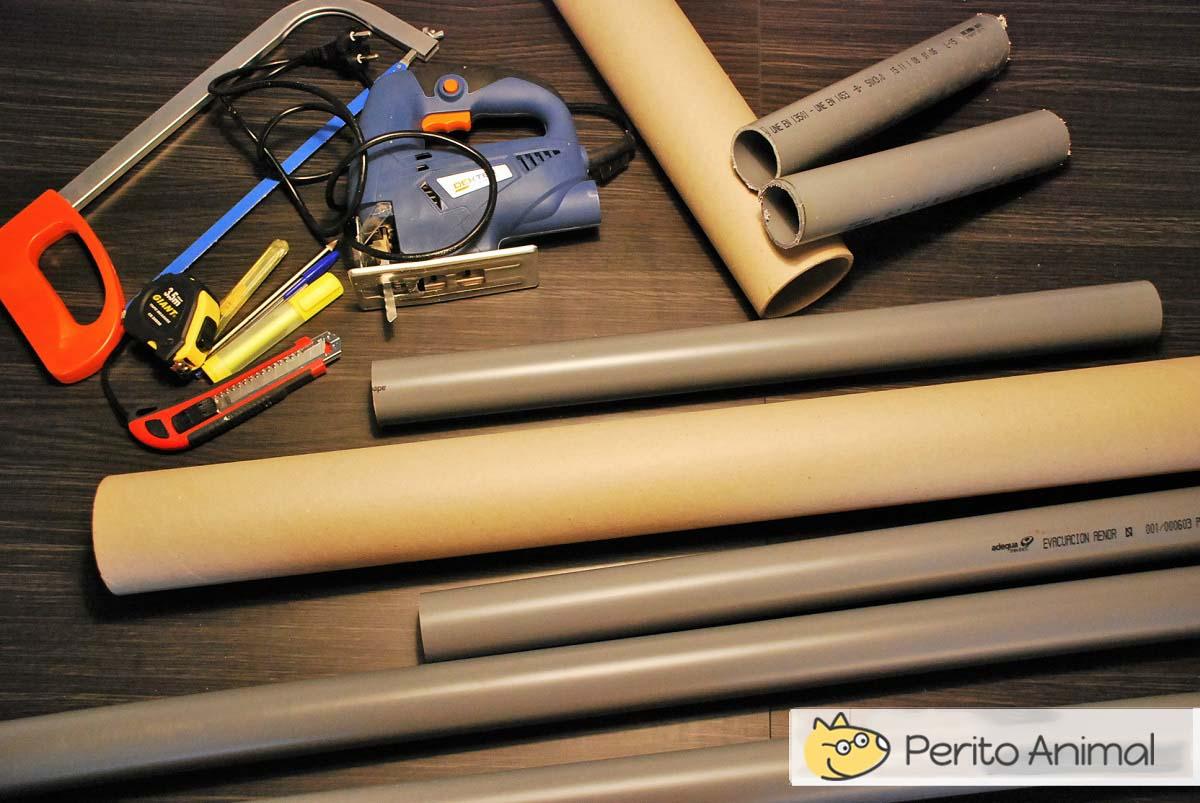 Os tubos podem ser tanto de plástico como de papelão, o importante é que sejam suficientemente fortes para suportar a estrutura que você deseja fazer. O número de ferramentas vai depender do quão simples ou complexo você deseja fazer o arranhador do seu amigo felino. Agora, vamos ver como fazer um arranhador para gatos passo a passo!