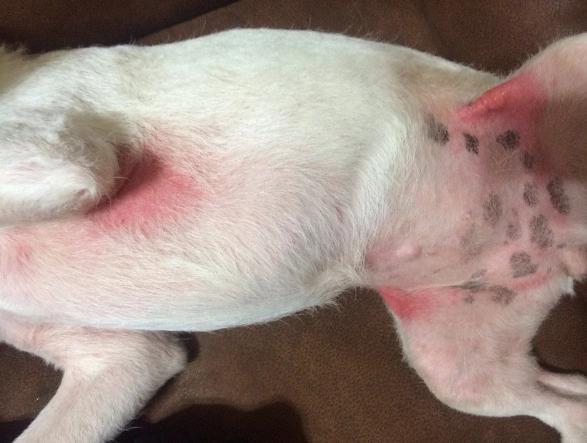 A irritação também pode ser causada pelo contato da pele com substâncias como a urina, ocasionando a proliferação de fungos e bactérias. Os locais mais comuns são os de acúmulo de sujeiras, como as dobras. Os sintomas mais frequentes são coceira, aspecto avermelhado na região, lambedura constante, alopecia, odor desagradável e, em alguns casos em que a pele está muito ferida, dor.