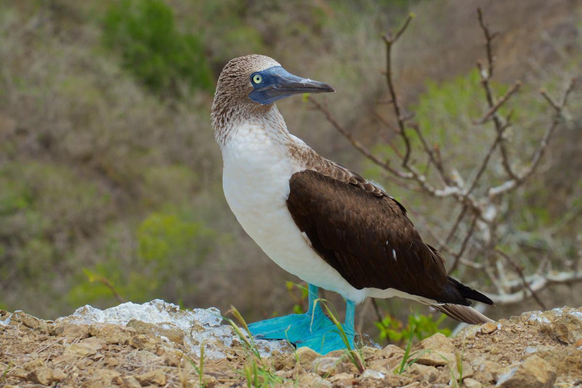 O patola-de-pés-azuis é uma espécie de ave marinha que se destaca por suas vibrantes patas azuis, um traço distintivo utilizado no cortejo e na escolha do parceiro. Esta ave possui plumagem branca, com asas e costas de cor marrom escuro ou preto, e um bico longo e reto.