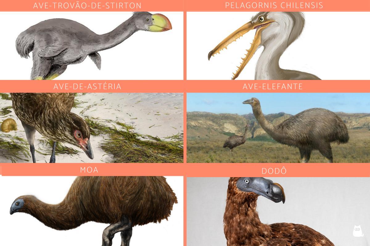 Agora que já sabemos que as aves pré-históricas vivas e extintas provêm dos dinossauros, vamos conhecer algumas espécies mais de perto. O grupo de aves pré-históricas extintas é muito amplo. Vejamos alguns exemplos: