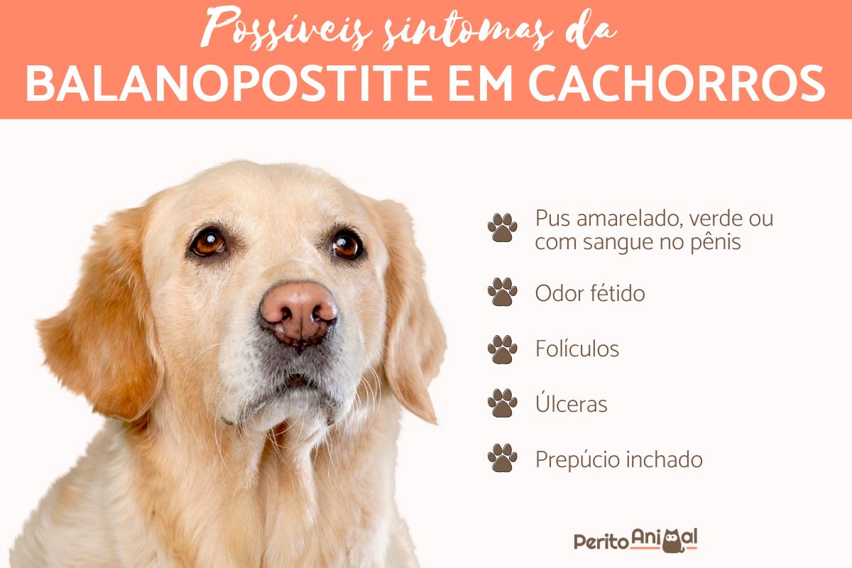 Outros sintomas da balanopostite são o odor fétido no pênis do cachorro, folículos e úlceras. Para além disso, é comum que o cachorro lamba excessivamente o pênis, devido ao desconforto que sente. Em alguns casos, o cachorro pode ter o prepúcio inchado.