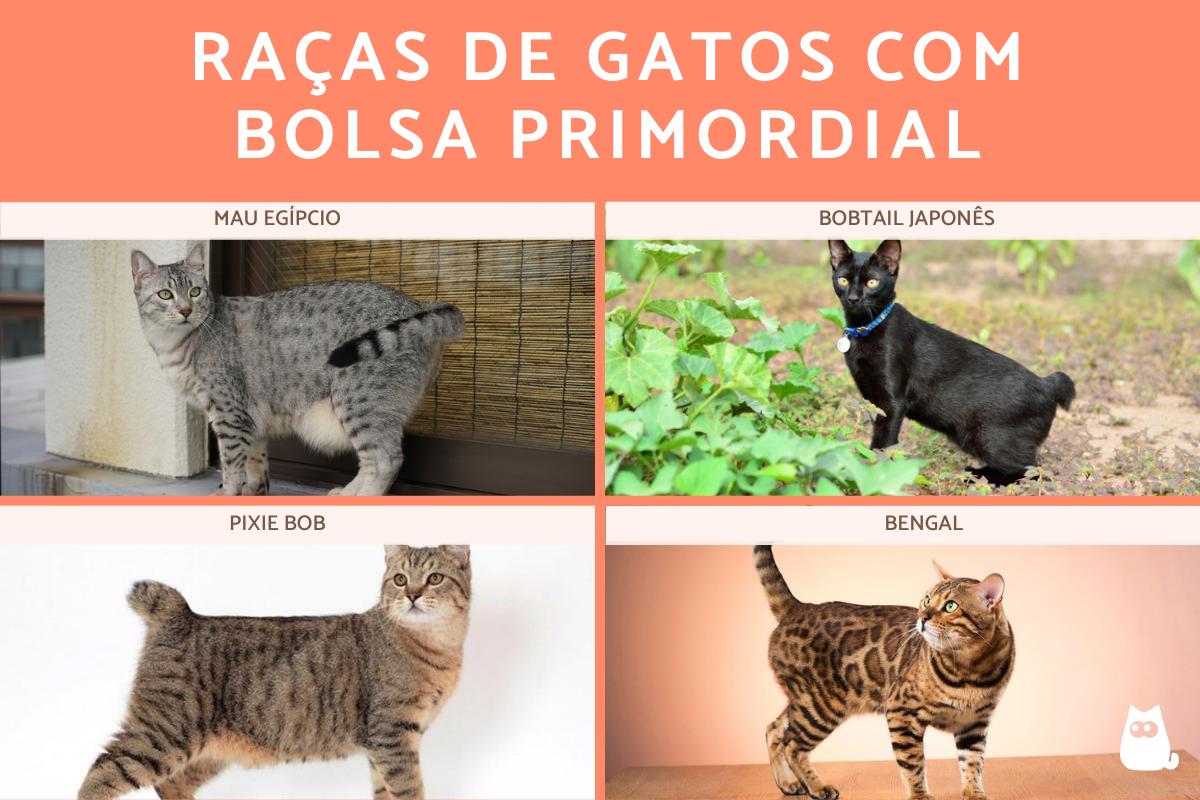 Nem todos os gatos têm uma bolsa primordial, como mencionado acima, essa característica não depende de sexo, idade, raça ou raça mista, condições individuais ou do ambiente em que vivem. Trata-se de uma herança genética que pode ou não desempenhar um papel, dependendo do gato. Entretanto, há algumas raças de gatos que precisam apresentar uma bolsa primordial para serem consideradas puras em seu padrão de acordo com exigências de federações felinas. Essas raças de gatos são: