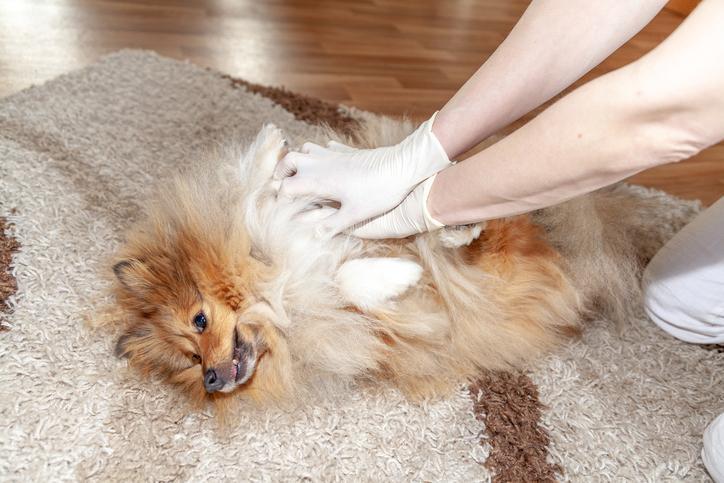 - Colocar o cachorro em uma superfície plana e sobre o lado direito. Se o cachorro for grande, se posicione atrás dele.