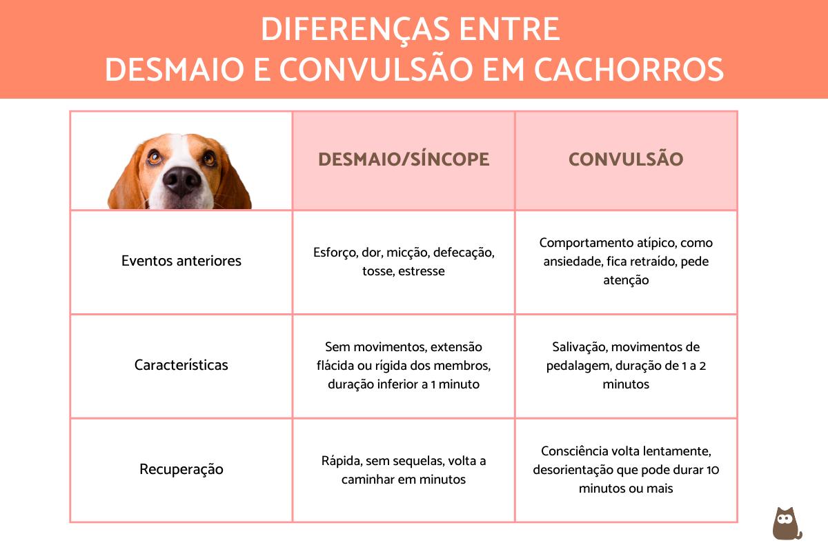 A convulsão generalizada é a mais confundida com a síncope, pois em ambas ocorre a perda repentina de consciência, que ocorre na síncope devido a uma diminuição do transporte de nutrientes até o cérebro, enquanto na convulsão ocorre uma atividade elétrica excessiva. Para facilitar o entendimento, colocamos algumas diferenças entre síncope e convulsão em cães em forma de tabela[1]: