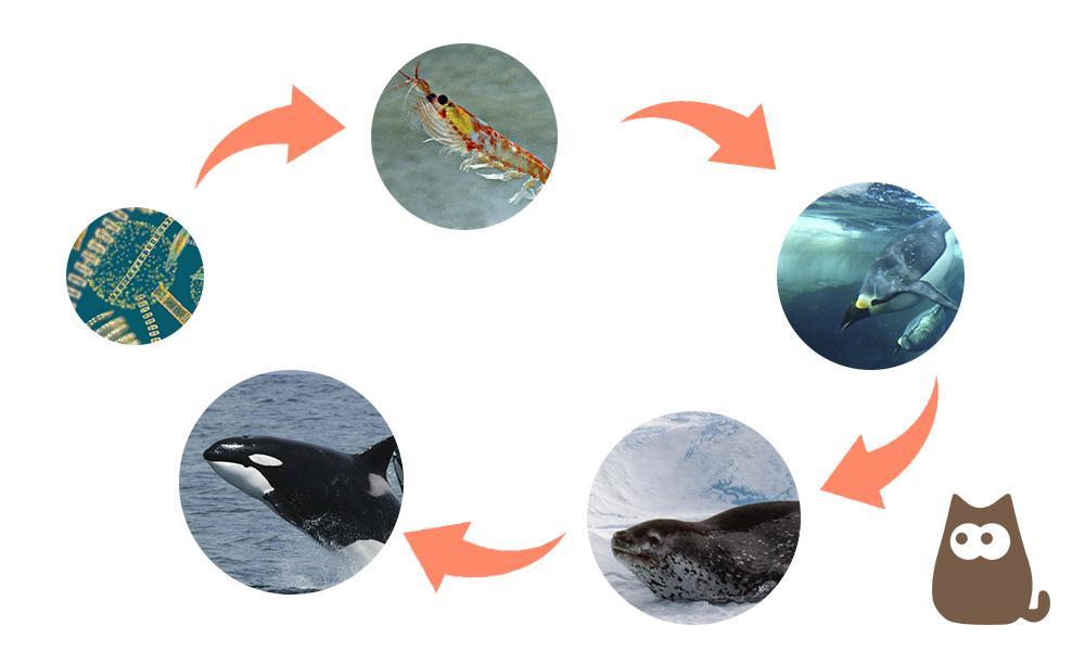 - Um exemplo de uma cadeia de cinco ligações onde podemos ver um supercarnívoro é o seguinte: Phytoplankton > krill > pinguim imperador (Aptenodytes forsteri) > foca-leopardo (Hydrurga leptonyx) > orca (Orcinus orca).