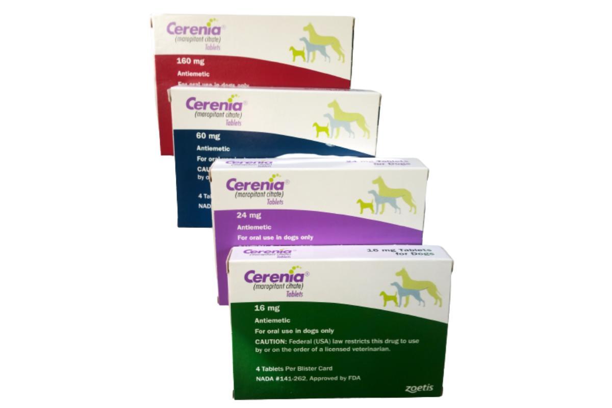Cerenia é um medicamento veterinário cujo princípio ativo é o maropitant. É um antiemético, ou seja, um medicamento destinado a tratar o vômito. Seu efeito antiemético ocorre ao antagonizar os receptores de neurocinina (NK-1) presentes no centro do vômito, localizado no Sistema Nervoso Central. Ao antagonizar esses receptores, ele inibe a ligação da substância P, que é considerada o neurotransmissor chave envolvido nos vômitos.