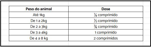 A dose do Chemital Gatos recomendada na bula é de 1 comprimido para cada 4kg de peso animal. Ou seja, se o seu gatinho pesar 2kg, ele deverá tomar meio comprimido, conforme a tabela na imagem abaixo.