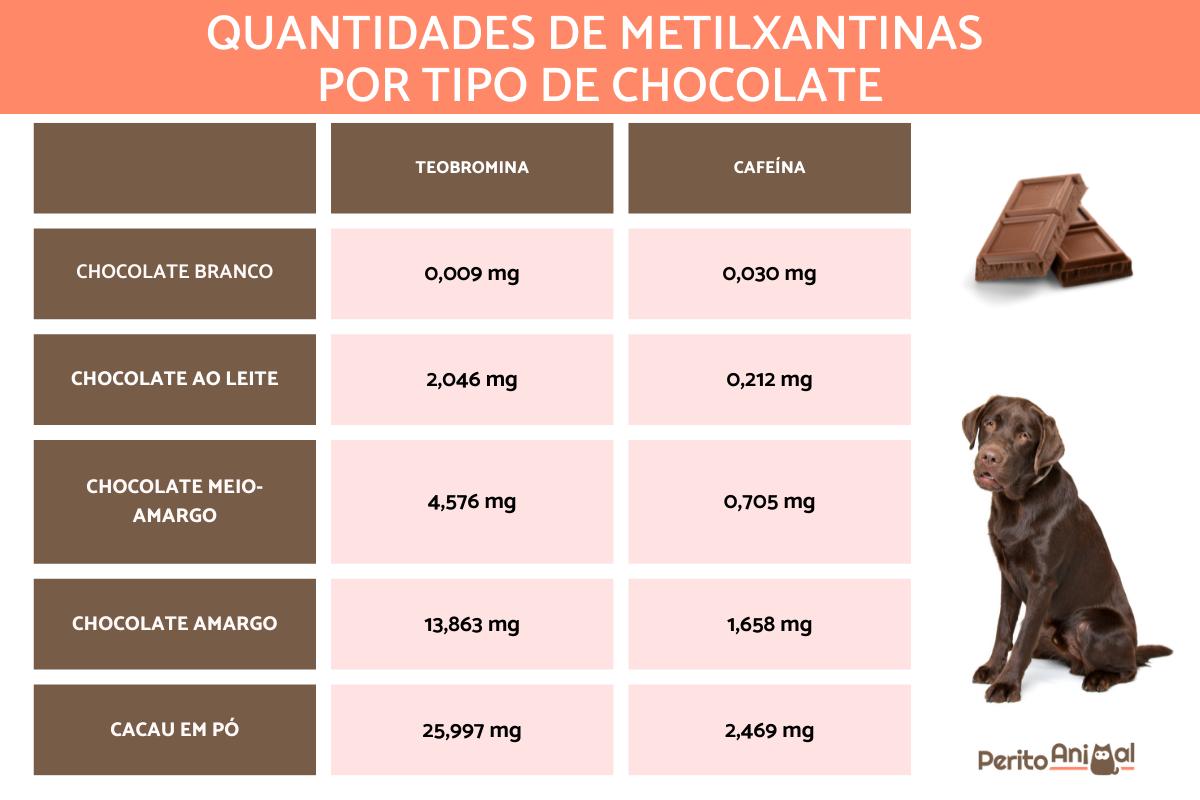 Cada tipo de chocolate possui uma determinada quantidade de teobromina e cafeína, sendo a quantidade tóxica para o cachorro dependente do chocolate ingerido, conforme a tabela abaixo.