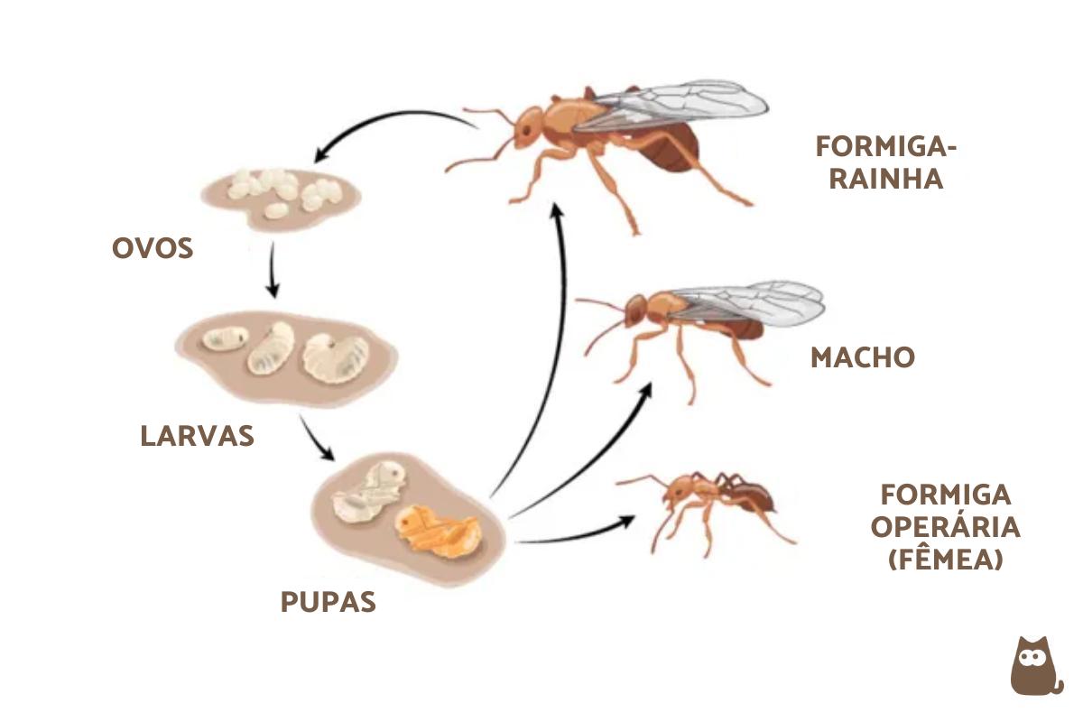 A rainha guarda o esperma dos machos até o momento de usá-lo. Quando chega a hora, ela põe os ovos e o ciclo de vida das formigas começa. Algo muito interessante que acontece nesses animais é que a rainha tem a capacidade de colocar ovos fecundados e não fecundados. Os ovos fecundados darão origem a fêmeas diploides, ou seja, com carga genética de ambos os progenitores; os não fecundados produzirão machos haploides, com metade da carga genética. Quando os ovos eclodem, o desenvolvimento das formigas começa, passando por uma metamorfose completa composta por várias fases: larva, ninfa ou pupa e adulta.