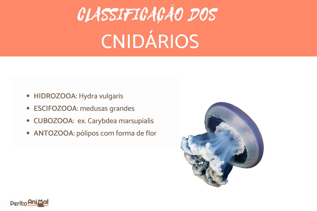 - Cubozooa: com forma predominante de medusa, algumas alcançam grandes tamanhos. São nadadoras e caçadoras muito boas e certas espécies podem ser letais para o ser humano, enquanto que algumas possuem venenos leves. (ex. Carybdea marsupialis).