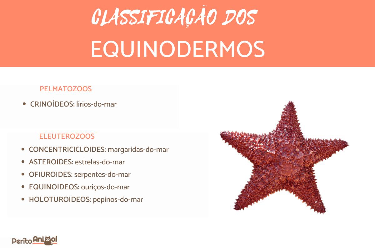 Este grupo de invertebrados (filo) é dividido em dois subfilos: Pelmatozos (com forma de taça ou cálice) e eleuterozoos (corpo estrelado, discoidal, globular ou com forma de pepino).