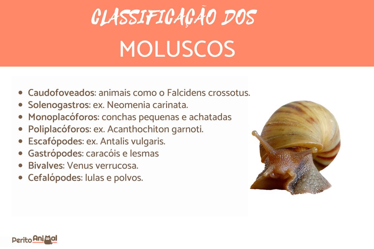 Este filo se caracteriza por ter um sistema digestivo completo, com a presença de um órgão denominado rádula, que se localiza na boca e tem função raspadora. Possuem uma estrutura chamada de pé que pode ser usada para locomoção ou fixação. Seu sistema circulatório é aberto em quase todos os animais, as trocas gasosas se realizam através de brânquias, pulmões ou a superfície do corpo e o sistema nervoso varia segundo o grupo. Estão divididos em oito classes, que vamos conhecer agora mais exemplos desses animais invertebrados: