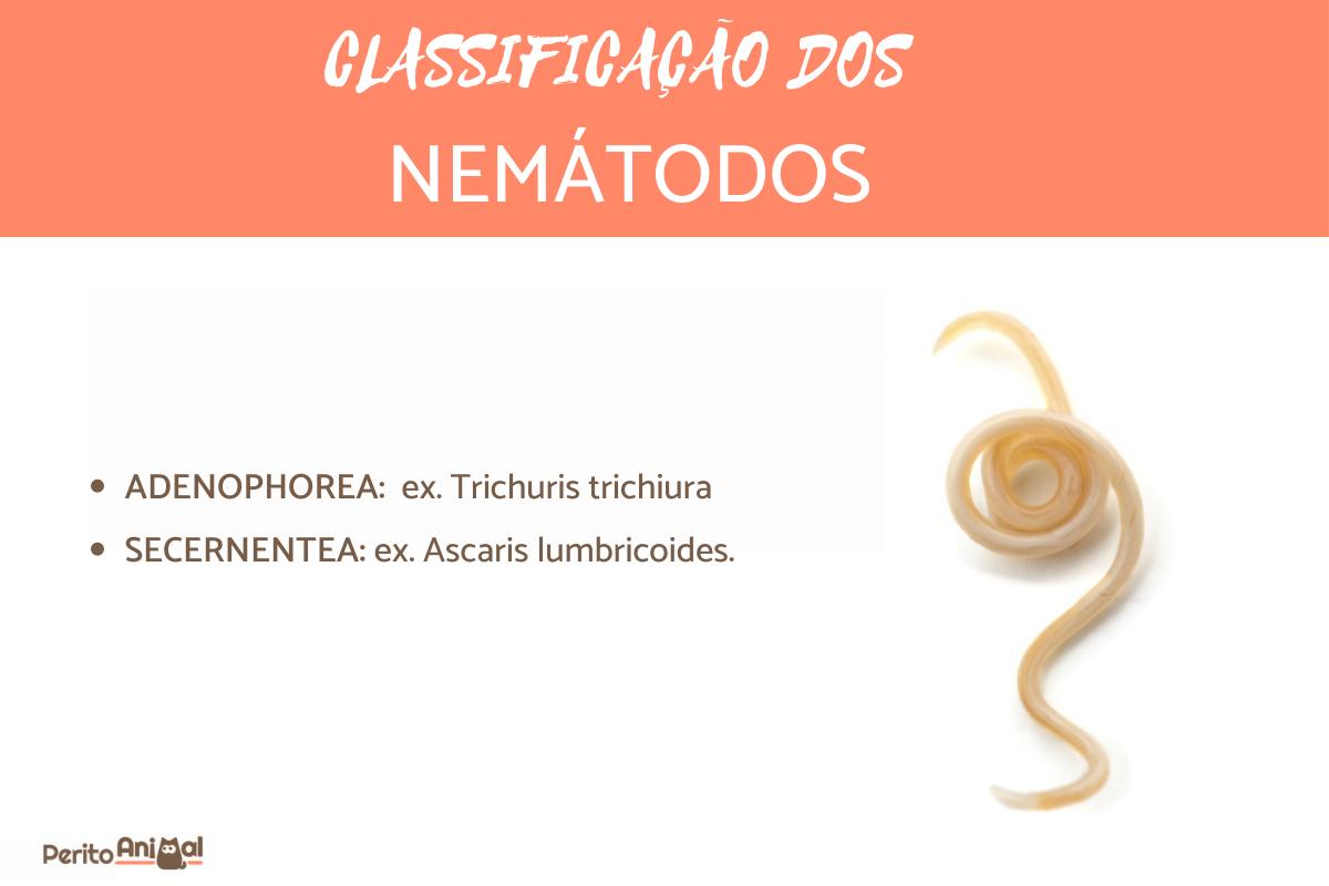 - Adenophorea: seus órgãos sensoriais têm forma circular, espiral ou de poro. Dentro desta classe podemos encontrar a forma parasita Trichuris trichiura.