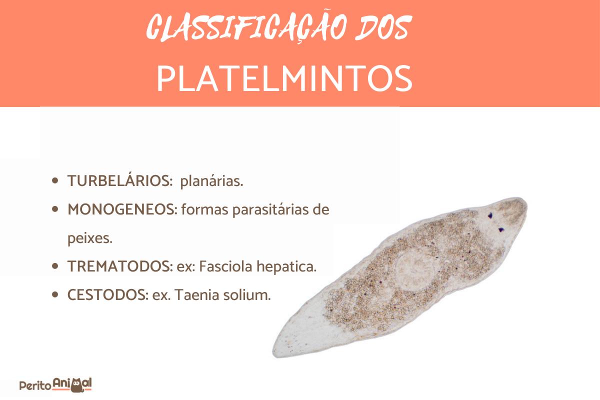 - Trematodos: seu corpo tem forma de folha, sendo caracterizados por serem parasitas. De fato, a maioria são endoparasitas de vertebrados (Ej. Fasciola hepatica).