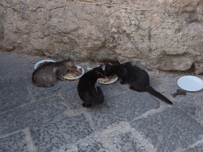 Na cidade, revirar o lixo é a principal forma de alimentação desses gatos, já que o acesso a potenciais presas costuma ser mais limitado. Naturalmente, eles também consomem o que algumas pessoas lhes oferecem. Há muitas pessoas que não sabem como ajudar gatos de rua de outra forma que não seja colocar comida na rua.