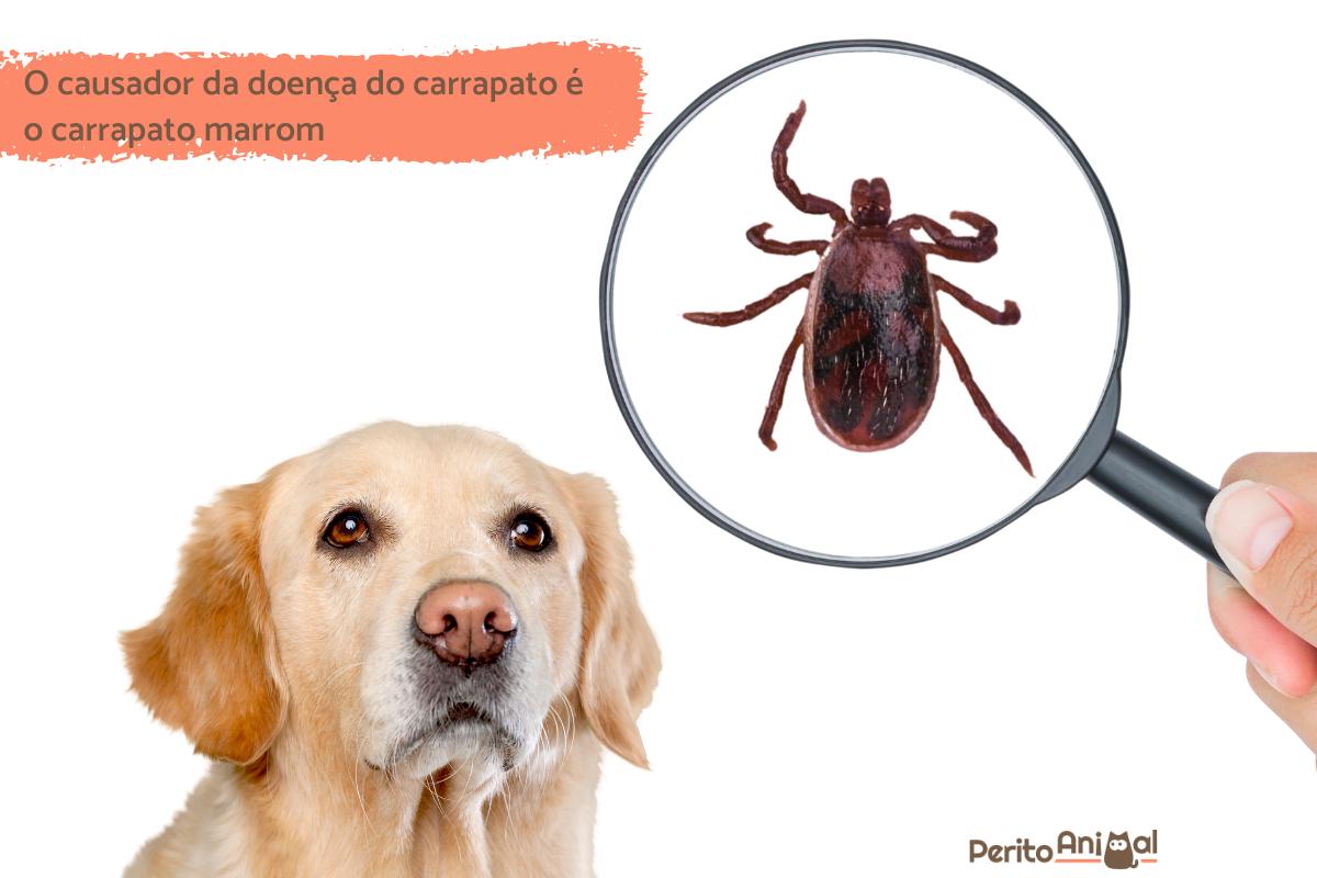 A erlichiose canina é uma doença infectocontagiosa, causada pela bactéria Ehrlichia canis, transmitida pelo carrapato Rhipicephalus sanguineus, também conhecido como carrapato marrom. Para que aconteça a transmissão, o carrapato deve se contaminar com a bactéria ao se alimentar do sangue do cachorro infectado, inoculando o agente causador em outro animal quando for se alimentar novamente.
