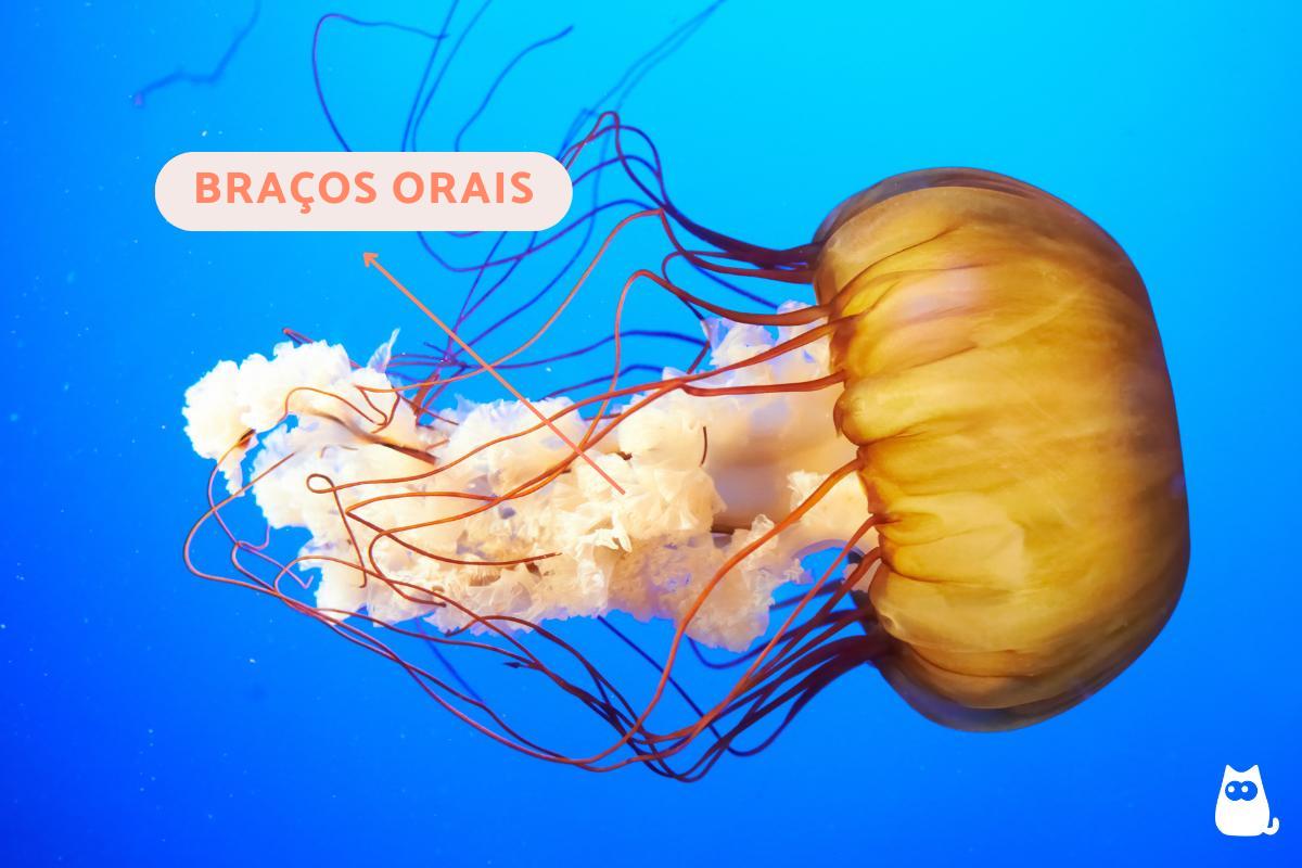 Os braços orais são estruturas alongadas e flexíveis que se estendem a partir do manúbrio, ao redor da boca, e desempenham múltiplas funções cruciais para a vida das águas-vivas. Situados na parte inferior central da exumbrela, esses braços variam em número, tamanho e forma conforme a espécie de água-viva, adaptando-se às suas necessidades específicas. Em termos gerais, os braços orais podem ser longos e finos ou curtos e firmes.