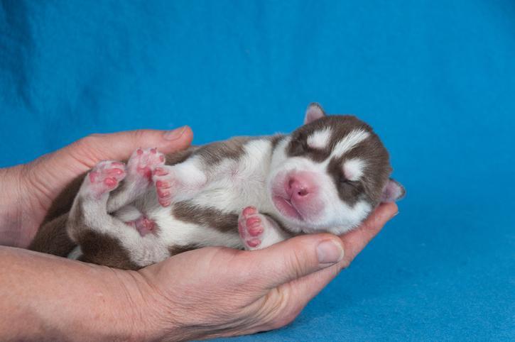 Quando os filhotes de cachorro nascem, eles são muito dependentes de sua mãe. São capazes de rastejar até o mamilo e começar a se alimentar, primeiro com o colostro, extremamente importante, e depois com o leite materno. No início eles não são capazes de enxergar, e ficam com os olhos fechados até cerca de 10 dias de idade. Podemos ver também que eles mantém um pedaço do cordão umbilical, cortado pelos dentes de sua mãe, por cerca de 7-10 dias.