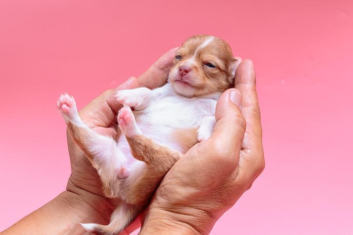 - Coloque o filhote de cachorro de barriga para cima, deitado sobre sua mão.