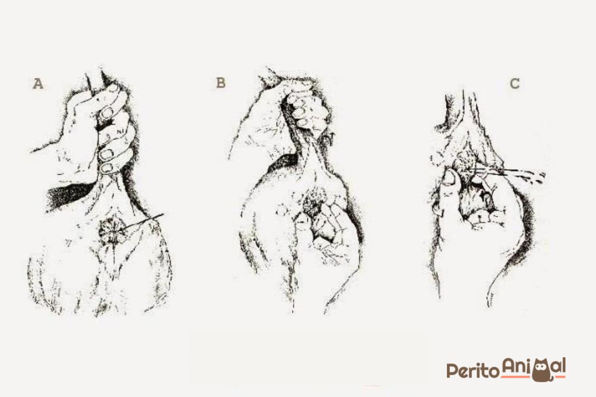 - Identifique os sacos no local indicado (entre quatro e cinco, e sete e oito nos ponteiros do relógio) e pressione com os dedos para dentro e para cima suavemente, aumentando a pressão aos poucos e sem machucar o seu gato.