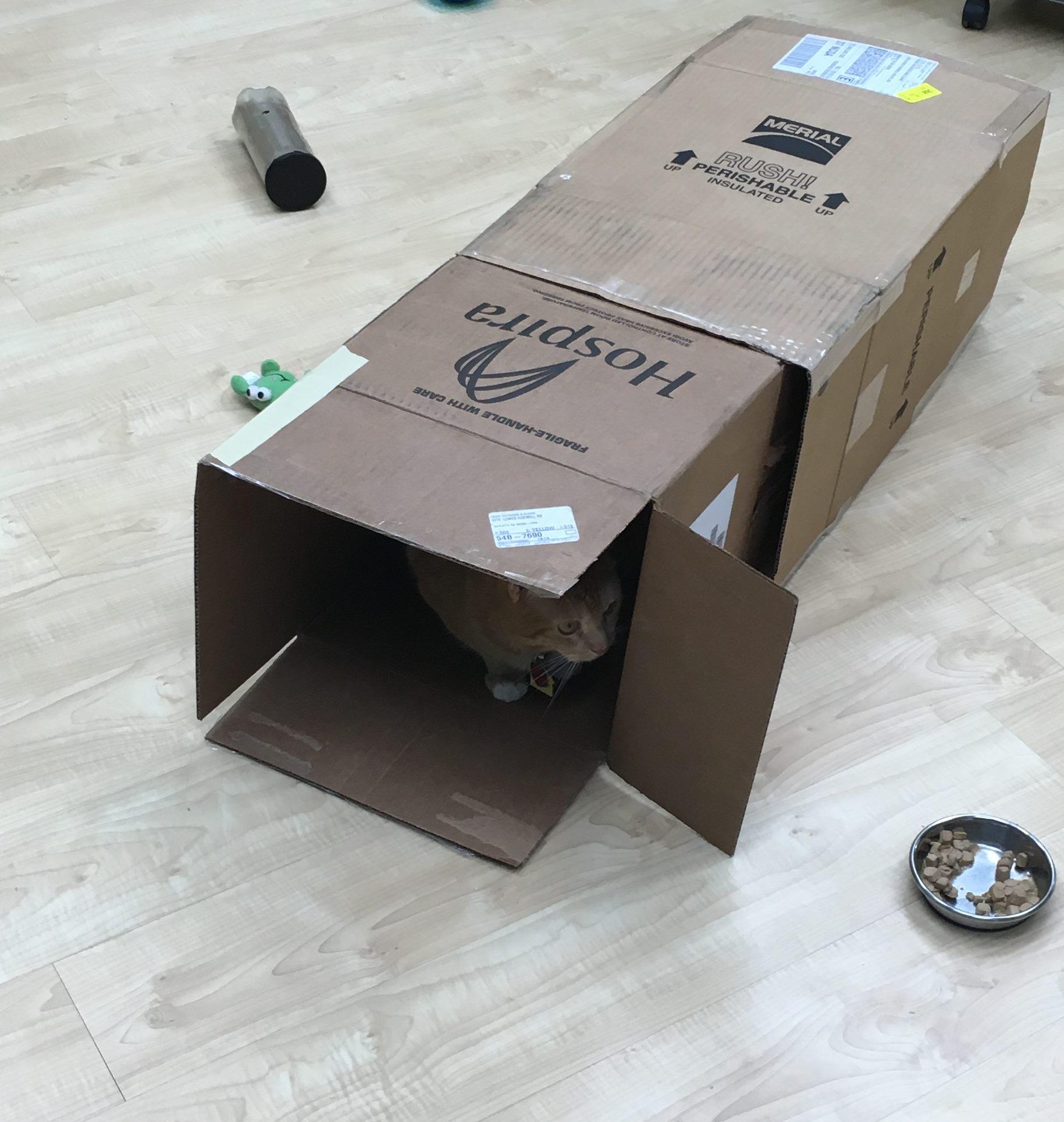 É bem simples fazer um túnel. Você só precisa de cortar as laterais de todas as caixas para garantir a conexão entre elas e juntar elas com fita adesiva para que não se soltem. As caixas devem ter tamanho suficiente para o gato passar sem se espremer.