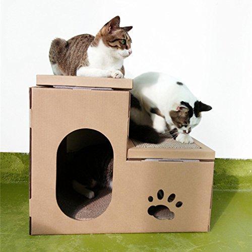 Se você gosta de artesanato e de fazer as coisas você mesmo, uma outra opção é tentar fazer uma casa dupla, ou seja, uma espécie de duplex para o felino, a qual também contará com um espaço para subir no topo.