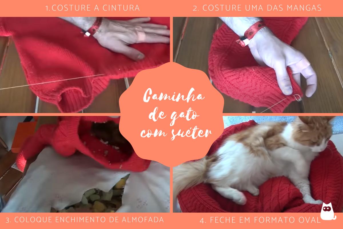 Veja abaixo uma foto com o passo a passo para fazer a caminha para gato com suéter para que você tenha uma melhor ideia de como ficará: